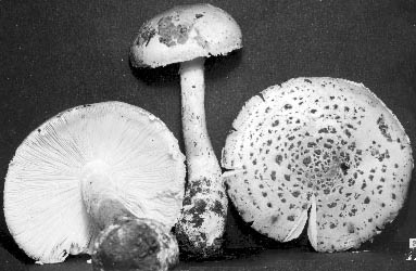 The gills are free, crowded, more cream-colored (in side view) than the pileus. The short gills are subtruncate to attenuate. When fresh, the odor is of fresh dough; sometimes the odor becomes more like "chlorine" in age. The spores measure (8.0-) 8.8 - 12.0 (-14.1) × (4.9-) 5.2 - 7.0 (-8.3) µm and are ellipsoid to elongate (very infrequently cylindric) and amyloid. Clamps are not present at the bases of basidia. Amanita cinereopannosa has a range extending through the eastern U.S. from New England down through the Appalachian Mountains at least as far as the Carolinas. It occurs in mixed forests including oak (Quercus) in the northeastern U.S.A. Bas placed the present species in his stirps Strobiliformis (see A. strobiliformis (Paul. ex Vitt.) Bertillon in Dechambre. As far as field identification goes, the reader should review and compare A. cinereoconia G. F. Atk., A. onusta (Howe) Sacc., and A. tephrea Bas nom. prov. -- R. E. Tulloss Photos: ; R. E. Tulloss (top left, West Virginia; others in body of text, Vermont); L. R. Hesler (middle line, Tennessee, with permission of Dr. R. H. Petersen, Curator, L. R. Hesler Herbarium, Univ. of Tenn., Knoxville); Dr. Clark L. Ovrebo (top right and bottom line,GSMNP, North Carolina).