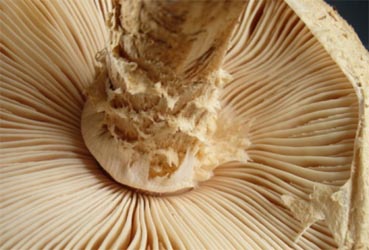 The next picture is of a specimen from New Zealand provided by Landcare Suppose that these still undetermined specimens can serve as a model for A. manicata with regard to the ring and stem decoration. The LR photograph shows that one could have missed the presence of an annulus if one examined only older material. The fibrils of the upper stipe appear to collapse into matted/felted scales, while the partial veil progressively disintegrates. In the second photograph the original strong differences between the two are being lost. On the other hand, the ring could tear away from the stipe at an earlier stage in expansion and to a greater degree than is shown in either photograph. Indeed, the 20 mm long appendiculate bits mentioned as sometimes hanging from the cap margin are very likely to be pieces of a shredded ring that is exposing its former "lower side" outward. The exposed surface is the side of the ring that was intimately connected with the brown fibrous internal limb of the volval during the later stages of development of the "button"--the internal limb develops between the stipe surface and the "lower" surface of the ring. The crazy coiffure of the upper stipe is very likely to have been created by the ring being pulled out and away from the stem by cap expansion. What would happen to the fibers attached to the underside of the ring during such expansion? It seems very likely that they would be stretched out from the stem until they separated from the underside of the ring or tore bits from the ring. An examination of the mechanics of the ring's connection to the unexpanded cap margin might prove very interesting. [Note: We are very interested in obtaining a scanned image of the painting said to be in Sri Lanka. Anyone having a relevant contact will receive our sincere gratitude in exchange for information leading to the appearance of that image at the top of this page.] It is interesting to note that some of the short gills in the New Zealand material do seem to be narrower than do the full length gills, but the photographs we've examined so far do not indicate that this is a constant character. [ Back to description of stem decoration ] We expect this web page to change as more specimens of Amanita manicata are made available to us. -- R. E. Tulloss and L. Possiel Photos courtesy of Dr. Don Hemmes (Hawaii; in text left) and Landcare Research (New Zealand; in text right).