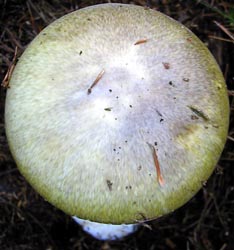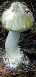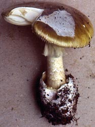 Technical description (t.b.d.) BRIEF DESCRIPTION: The cap of Amanita phalloides is (40±) 65 - 152 (-300±) mm wide, with pigment arranged in narrow bands of variously colored spots giving the illusion of multicolored radially arranged imbedded fibers. Among the colors involved are pale to dark variance of olive-green, yellow green to yellow, gray, and brown. Often described as dark fibers on a greenish or yellowish ground color; however, this is an optical illusion. Sometimes the center of the cap may be entirely of the darkest tints while sometimes the center of the cap may appear bleached. The cap is often palest at the margin (for example white or extremely pale yellow or extremely pale yellow green). The cap is subovoid to hemispheric with incurved margin at first, becoming convex, eventually subplanar with decurved margin, smooth, wet and sticky when moist, shiny when dry, sometimes faintly pruinose particularly over the center, with a nonstriate and nonappendiculate margin. The volva is absent or occasionally present as membranous patch, white to sordid white to pale beige. The flesh is white except for a yellow line below the cap skin, however the yellow tint disappears with age, with such a line disappearing in age, unchanging when cut or bruised, 4.5- - 7.5+ mm thick over the stem, thinning evenly to margin. The gills are free to narrowly adnate, crowded, white to cream in mass, white to cream to faintly pinkish cream to sordid cream to cream with slight yellow-greenish tinge in side view, unchanging when cut or bruised, 6 - 9 mm broad, with or without decurrent line on stipe apex. The short gills are truncate to excavate truncate to subtruncate, unevenly distributed, of diverse lengths, common, and occasionally arising at the stem as well as at the cap margin. The stem is (35±) 54+ - 135 (-300±) × 8 - 17.5 (-20+) mm, largely white to pale yellow below the ring, sometimes more strongly yellow near the stem base, sometimes with faint yellowish white areas above the ring, narrowing upward, slightly flaring at the top in age, decorated with fine raised concolorous fibrils that darken from handling sometimes forming the "flame" pattern especially in the lowest third of stem. The bulb is 20 - 35+ × 16 - 50 mm, globose to subglobose, sometimes slightly compressed vertically, white, and very soft. The ring is in the upper part of the stem, membranous, up to 30± mm from the stem to its edge, white to pale yellow with fine radial striations on the upper side, somewhat felted and ranging from white to containing one or more of the cap colors (which may be in irregular patterns) on the under side. The limbate volva is white on outer surface, white to yellow or with other tints from the cap (sometimes similarly unevenly pigmented) on the inner surface, membranous, persistent, opening somewhat irregularly, with top of limb up 26- - 65 mm from the base of the bulb, with the limb more or less the same height as the bulb vertical thickness. The odor is sometimes absent in early development, eventually sickeningly sweet or cloying like a "sweet ester." The spores measure (7.5-) 8.0 - 10.1 (-13.5) x (5.5-) 6.1 - 8.0 (-10.5) µm and are subglobose to broadly ellipsoid to ellipsoid and amyloid. Clamps are not found at bases of basidia. This species is deadly POISONOUS. Amanita phalloides was originally described from Europe. In Europe in occurs with beech (Fagus), oak (Quercus), pine (Pinus), chestnut (Castanea), horse chestnut (Aesculus), birch (Betula), filbert and hazelnuts (Corylus maxima), iron wood or hornbeam (Carpinus), and spruce (Picea). In the northern hemisphere the present species when transplanted can spread to local trees of the same genera in addition to Canadian hemlock (Tsuga). It is reported under Leptospermum in New Zealand and under Eucalyptus and leguminous trees in Tanzania. Importation in the western hemisphere has occurred from Canada to Argentina. This species is easily exported with its symbionts (oaks, pines, nut trees, etc.). As a consequence, it has been introduced in many countries in which European trees of its symbionts have been planted. It can then be exported from those countries it has colonized. It would appear that it and A. muscaria (L. : Fr.) Lam. subsp. muscaria have been the most commonly exported species of Amanita. Everywhere it has been imported, it is a major cause of life-threatening mushroom poisonings. See also, A. arocheae Tulloss, Ovrebo & Halling, A. fuliginea Hongo, A. marmorata Cleland & E.-J. Gilbert, and A. subjunquillea S. Imai. The reader may want to examine the recently revised key to the taxa of sect. Phalloideae in North America. The name Amanita phalloides f. alba Britzelm is often seen in the literature. The white specimens of A. phalloides usually occur among ones with normal coloration. The name probably has no taxonomic value. Historically, white specimens of A. phalloides appear to have caused some taxonomic and nomenclatural confusion because they were taken for specimens of A. verna (Bull. : Fr.) Lam. or another white species of sect. Phalloideae. In this regard, Neville and Poumarat (2004) treat Amanita verna var. tarda Trimbach and Amanita andaryi Mornand nom. inval. as synonyms of the white phalloides which they treat at varietal rank. Based on the available information, RET concur with their judgment. -- R. E. Tulloss and L. Possiel Photos: R. E. Tulloss (New Jersey)