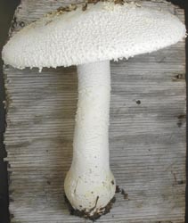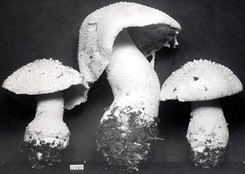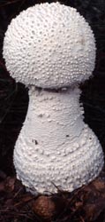 Technical description (t.b.d.) BRIEF DESCRIPTION: The cap of Amanita polypyramis is 70 - 180+ mm wide (and sometimes much larger) convex to plane, white, dry to subviscid, appendiculate, with a nonsulcate margin. The cao us 12,5 - 17 mm thick. It has a white, soft, pulverulent-subfloccose layer of volva on expansion of cap breaking up into small, conical warts up to 2 mm high and broad or shapeless, small, soft warts to patches or merely forming a flocculence over the whole cap or parts of it. The gills are crowded to subdistant, free to adnexed or just touching the stem, cream to yellowish cream in mass, white to cream to sordid cream in side view, and 7- - 13.5 mm broad. The short gills are attenuate. The stem is 76 - 180 x 10 - 35 mm (length includes length of bulb), equal or tapering upward, solid, white, usually exannulate, completely pulverulent-verruculose when young, and glabrescent with age. The stipe's bulb is 37 - 57 x 39- - 49 mm and subglobose to turbinate to irregularly oblong. The ring is copious, but fragile, white, decorated with large and small pieces of the volva's limbus internus on the underside. The spores measure (7.0-) 9.1 - 13.0 (-17.5) x (5.2-) 5.9 - 7.8 (-9.5) µm and are amyloid and ellipsoid to elongate (rarely cylindric). Clamps are absent at bases of basidia. The smell of this species is quite strong and in the "decaying protein" group. Bas (1969) created a stirps Polypyramis that includes the present species as well as A. boudieri Barla and A. pulverulenta Beeli. Recently, A. yenii Zhu L. Yang & C. M. Chen was described as belonging to the same stirps. The species was originally described from South Carolina, U.S.A. and is now known from the Pine Barrens of southern New Jersey to tropical Oak (Quercus) forest in Costa Rica. The species can be recognized by the plentiful small pyramids on the cap and bulb and by its tendency to produce very large fruiting bodies. The name A. alexandri Guzman was applied to diseased material of A. polypyramis as demonstrated by Morales-Torres et al. (1999). The strong odor of cheese from the "A. alexandri" specimens is associated with extensive penetration of the fruiting body by an as yet unidentified hyphomycete. -- R. E. Tulloss Photo : Dr. L. R. Hesler (top left, Tennessee, with permission of Dr. R. H. Petersen, L. R. Hesler Herbarium, Univ. of Tenn., Knoxville); Mr. Cornelius Hogenbirk (top right, southern New Jersey); R. E. Tulloss (middle & bottom, Great Smoky Mtns. Nat. Pk., Tennessee).