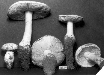 range, and has been collected as far north as Cape Cod. Photos: L. R. Hesler (top, Florida, with permission of Dr. R. H. Petersen, Curator, L. R. Hesler Herbarium, Univ. of Tenn., Knoxville); R. E. Tulloss (bottom, Mississippi) [ top ] Amanita rhoadsii var. flavotingens Bas The following description is based on the original description by Bas (1969). The cap of Amanita rhoadsii var. flavotingens is 65 mm wide, plano-convex, white, turning yellow when bruised, dry, with a nonstriate margin. The cap is completely covered with a powdery-somewhat finely fibrillose volval layer, sometimes with fluffy, floccose, small warts sometimes near the center. The flesh is white and turning yellow when cut. The gills are crowded, touch the stem, rather narrow, white, yellow when bruised. The short gills are attenuate. The stem is 80 × 10 mm, solid, white, yellow where bruised, covered with floccose material, lacking a ring, cylindric. The bulb is elongate-radish-like and 40 × 25 mm. The volva is present as some vague, friable fragments on the top of the bulb. The flesh is white, turning yellow when cut, at length turning reddish brown. The taste is mild. The odor is slightly pungent but not of decaying protein ("chloride of lime"). The spores measure 10 - 12 × 3.5 - 4.5 µm and are cylindric to bacilliform, slightly yellowish, and amyloid. Clamps are present at bases of basidia. This species was originally collected from Florida (USA). The tree association is unknown. Among the differences from the type variety are the yellowing reaction, the strong gelatinization of the cap surface including cap flesh below the volval remnants, the alteration of the odor, the spores are shorter, and the length to breadth ratio is not reported to exceed 3.2. RET questions the taxonomic value of this variety because the yellow staining (with the eventual transition to red-brown in the stem) suggests the "yellowing syndrome" seen in other species of section Lepidella in Eastern North America. The unusual degree of gelatinization (decay?) of the cap and the reduction in size of spores are other characteristics that suggest this specimen was diseased. For more notes on the "yellowing syndrome" see A. subsolitaria (Murrill) Murrill. -- R. E. Tulloss and L. Possiel [ top ]