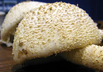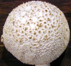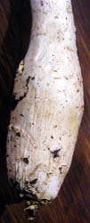Technical description (t.b.d.) BRIEF DESCRIPTION: The following is based on the description of Bas (1969). The cap of A. rhopalopus is (30-) 50 - 180 mm wide, white, with the center sometimes subumbonate, although usually somewhat depressed with age. This species has a nonsulcate, appendiculate, initially inflected margin that may extend several mm beyond the ends of the gills. The cap is densely covered with whitish, adnate to subdetersile, subverrucose, floccose-felted or subfelted patches, irregularly shaped, subfloccose warts or, especially at the center, subfloccose, conical warts. The gills are crowded to rather crowded, free to narrowly adnate, moderately broad to rather narrow, thin, and white to pale cream. The shortest gills are truncate; the remainder of the short gills are attenuate. The stem is about (50-) 120 - 200 x (4-) 10 - 25 mm, subcylindrical or narrowing upward, solid, white, mostly with some inconspicuous to rather distinct, subfloccose-felted warts, scattered or in a few circles at the base of the stem. The apex of the stem may be floccose from remnants of the annulus that is usual torn early in development and uncommonly leaves an appressed floccose ring near the stem apex. The basal bulb of the stem is often deeply rooting, mostly enlarged, cylindric to subclavate to fusiform. A small bulb collected whole measured 70 x 31 mm; however, the bulbs can get much larger than this. There are false rootlets at the base of the bulb. The odor of this species is strong and pungent of decaying protein. The spores measure (7.3-) 8.0 - 10.9 (-12.5) x (4.8-) 5.4 - 6.8 (-8.1) µm and are amyloid and ellipsoid to elongate. Small clamps are present at bases of basidia. Amanita rhopalopus was originally described from the eastern U.S. Its range is presently known to extend from New York to Tennessee and North Carolina. It is found in oak, pine-oak, and beech-oak forests. It appears to be an upland species in the southern part of its range. The present species can be confused with an as yet undescribed taxon that has a largely overlapping distribution. The undescribed entity is also white with flocculent volva; however, its stem base is narrower and radicates so deeply that I've never known a specimen to be collected in its entirety. The annulus of the undescribed species is distinctly less membranous from the outset; and its spores are markedly more narrow on average than in A. rhopalopus. In my experience, the undescribed species is more common than A. rhopalopus in some regions and is often misdetermined as A. rhopalopus.